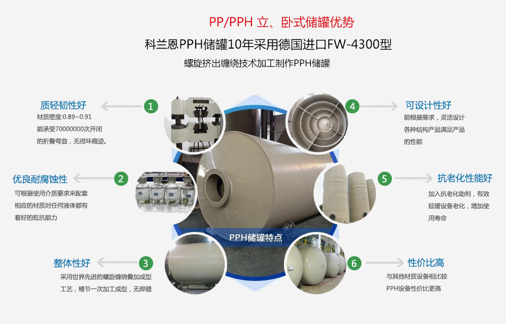 本公司依托国内的多家高校和科研机构,已引进全套精良的PP/PPH/HDPE全自动无缝缠绕一体成型的生产线和自动化焊接技术及生产装备,保证了大型塑料设备加工的质量和精度,实现了从主体到附件,完全用同牌号材料加工制作而成。可根据需要储存的介质的性质和温度选择进口或国产原材料来生产不同系列等级的各种大型塑料环保设备。